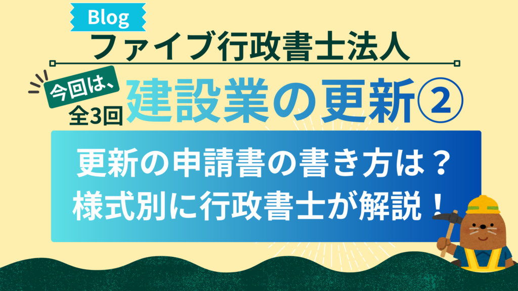こんにちは!ファイブ行政書士法人の菅野です。 今回のテーマは、前回に続き「建設業の更新」についてです。全3回に分けて、建設業更新について説明をしてきます。今回は2回目「申請書の書き方」について説明します。前回記事はこちら … 続きを読む 【第2回】更建設業許可の更新とは?行政書士が申請書の書き方を解説!