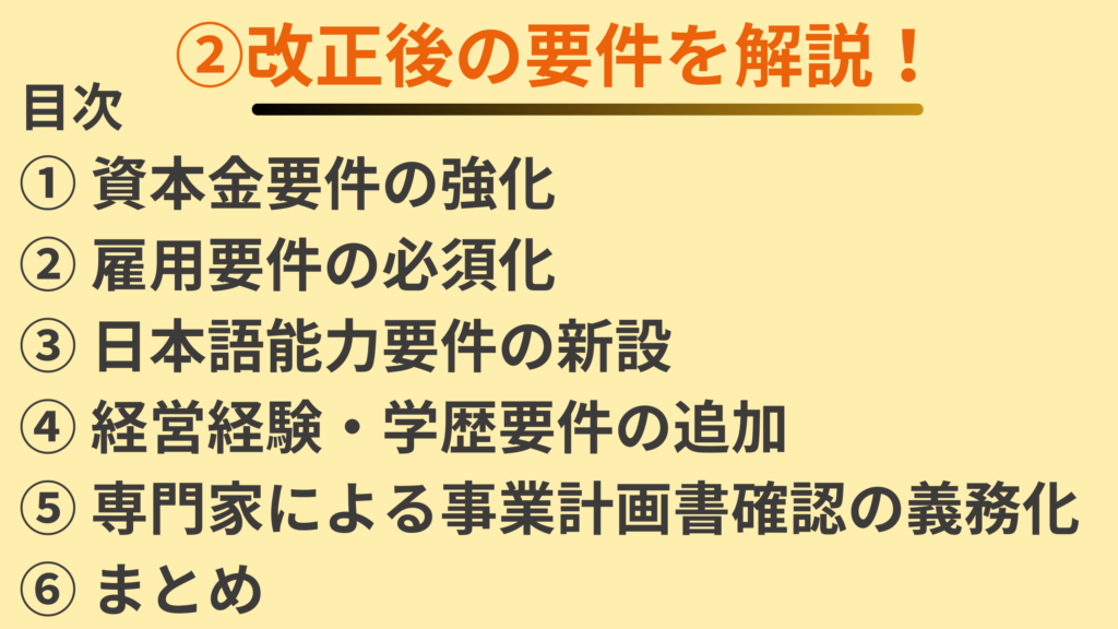今回の改正で、「実態のある事業運営」が求められるようになり、「資金」「経営力」「コミュニケーション能力(日本語能力)」などの要件が強化、新設されました。